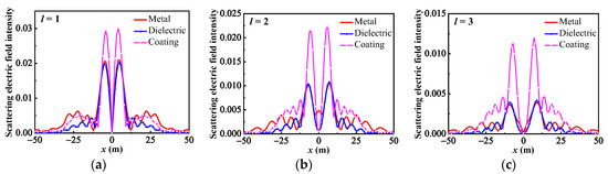 Based on the above discussion, we selected the vortex beam with x-polarization incidence and the scattering field in the x direction for further research and analyzed the influences of the beam parameters on targets with different dielectric parameters. Three typical targets with different dielectric parameters, namely a PEC target, a dielectric target (dielectric parameter: ), and a coating target (coating thickness: 0.1 m, dielectric parameter ) [47], were selected. Figure 8 shows the scattering field intensities and the OAM spectral distributions (x-components) of vortex beams carrying different topological charges incident on PEC, dielectric, and coating targets. The incident frequency was set to 5 GHz, the topological charges were l = 1–3, and the half-cone angle was . The receiving plane was located 60 m away from the target. For a more intuitive illustration, Figure 9 and Table 1 present the one-dimensional intensity distribution of the scattering field in the polarization direction and the total proportion of each mode on the sampling surface, respectively. The bold display in the table shows a special mode proportion of the scattering field, which is the same as the incident field mode. The scattering field intensity distributions differed for targets made of different materials. For all three targets, other modal values occurred as the observation radius increased. In particular, for the metal targets there were other obvious modes, whereas for the dielectric and coating targets there were not. Of the three targets, the coating target had the largest peak value of the scattering electric field, and the original incident mode was best maintained. With an increase in the topological charge, the scattering-field intensity distribution showed a clear outward diffusion trend. The total proportion of the modes in the scattering field, which was consistent with that of the incident mode, also decreased in all three cases. We found that the scattering field intensity and OAM spectra may reflect the characteristic parameters of the target, such as the type of target material and the coating method. Based on this, it may be possible to identify and invert the target parameters.