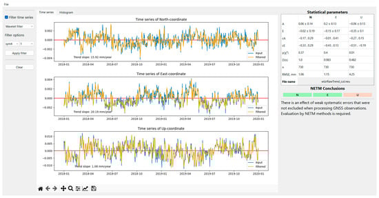 To start working with PS-NETM, the user needs to specify the path to the input data. Once the data are successfully adapted to the software environment, the interface displays time series plots (a time series tab) and histograms of the residual error distribution for each coordinate component N,E,U (Histogram tab).
