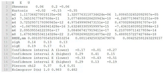 All these data can be exported for further processing. To export tabular data, the export conclusion function (file–export conclusion) is used. It should be noted that along with information that is present on screen, the ‘export’ option also writes the values of unbiased central sampling moments, which are used to calculate skewness and kurtosis (see Equation (6)) (Figure 3). If the export is successful, a corresponding message appears on the screen.