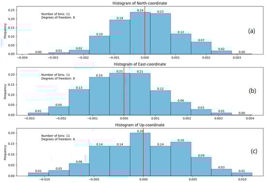 As can be seen from Figure 4, a separate histogram is created for each individual coordinate, as they are individually analyzed by PS-NETM. Each bar has a relative frequency on top of it, depicting how many residual values it contains. The red line is used for a more comfortable visualization of distribution, as it clearly depicts whether it is the zero mean or not.