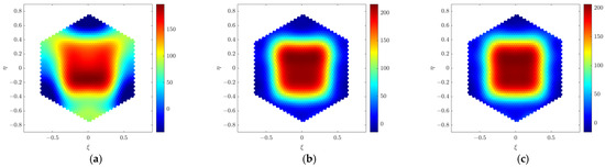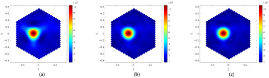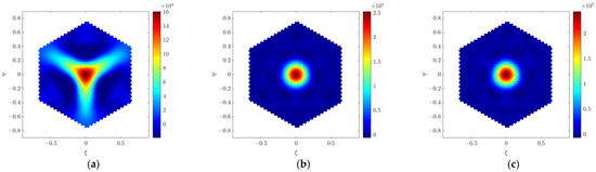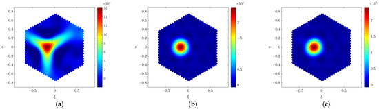 Figure 3 shows the imaging simulation results of the point source placed at boresight when the far-field imaging method (G-matrix method) is applied. It can be seen from Figure 3a that the reconstructed far-field point source shows good imaging quality. In the near-field simulations, the distance between the array and the target source is set to 2 m, 5 m, and 50 m, respectively. Imaging results at different near-field distances are shown in Figure 3b–d. Obviously, the far-field imaging method brings large distortions to the near-field point source. The distorted shape of the point source is similar to the shape of the array in the Y-shape. Moreover, the distortion becomes more severe as the distance gets closer. The near-field distortion is present at a general far-field distance of 5 m, and the distortion essentially disappears at an absolute far-field distance of 50 m. The imaging result at a distance of 50 m is in good agreement with that obtained in the far-field condition.
