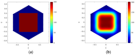 The extended source is set to a rectangular scene with a side length of 0.4 at . Figure 6a shows the BT distribution. Figure 6b shows the imaging result of the extended source in the far-field condition. In the near-field simulations, the distance between the extended source and the array is set to 2.46 m. The RMSE difference between near-field and far-field images is computed. The calculation of is as follows: