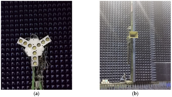 Indoor experiments were carried out in an anechoic chamber. Figure 8a shows the system used in the experiments. It is an L-band 10-element Y-array ASR. The antenna spacing is 0.88λ. A rectangle horn antenna is used to generate the point source signal as shown in Figure 8b. The distance between the transmitting antenna and the antenna array of the radiometer is 10.06 m and 2.46 m, respectively. Figure 9 shows the photographs of the experimental scene for imaging the near-field point source. As mentioned in the previous section, the general far field and the absolute far field are 5 m and 50 m. Therefore, the observed target at a distance of 2.46 m is in the near-field area of the system. The observed target at a distance of 10.06 m is in the general far field of the system.