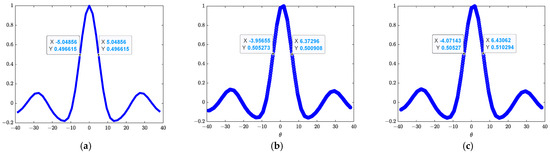 The spatial resolution was measured from the imaging results of the point source at a distance of 2.46 m, and the point source is aligned with the center of the array. A rectangular window was applied to the visibilities. Figure 13 shows the profile plot for a single point at . Figure 13a is the simulation result in the far field, and the resolution is 10.1°. Figure 13b,c are the experimental results in the near field. The reconstructed images using the near-field G-matrix and F-matrix methods are consistent. The corresponding spatial resolution is 10.3° and 10.5°. Theoretical analysis, simulation, and experimental results are matched.