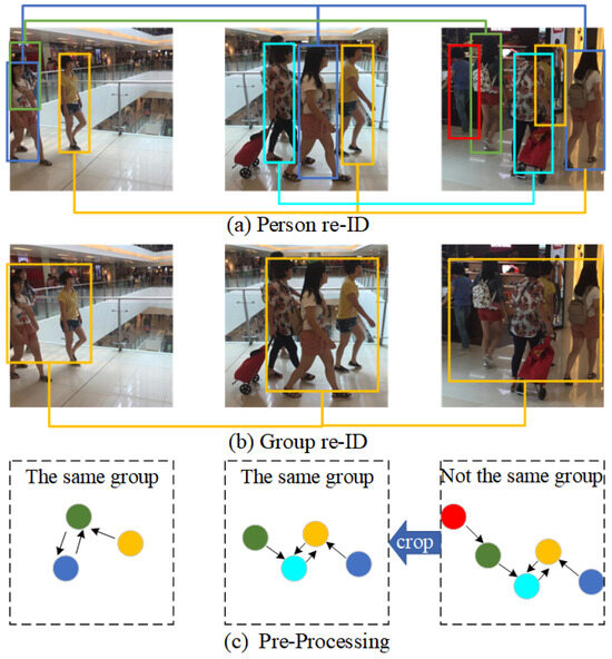 Group re-ID focuses on aligning groups of objects observed from various camera viewpoints. Most existing methods utilize contextual information from neighbors to assist re-identify each group member within groups [8,9,10,11]. Utilizing group context information has demonstrated its effectiveness in mitigating ambiguity in single-object re-ID [10,12,13]. Therefore, the process of group re-ID can effectively be applied to person re-ID in groups. In comparison to single-object re-ID, group re-ID presents greater challenges because of the changes in group members and layout. The person as an object and group re-ID are shown in Figure 1a,b. The current group re-ID methods can be categorized into two types: feature aggregation-based [11,14] and crowd matching-based methods [15,16]. The first category of method aggregates the contextual information from neighbors to re-identifying each group members within groups. For example, Yan et al. [14] devised a multilevel attentional mechanism to capture intra- and inter-group contexts and suggested a novel uniform framework for group re-ID. However, these approaches neglect the significance of background features, which can be used to assist message transmission between group nodes. The second category of method usually adopts a single- or multi-object matching strategy and assigns important weights to objects to capture the dynamic changes within the group. For example, Lisanti et al. [16] presented multi-granularity representation for group images, which they combined with a dynamic weighting approach to obtain improved people matching. However, these methods cannot solve the problem of group members changes well.