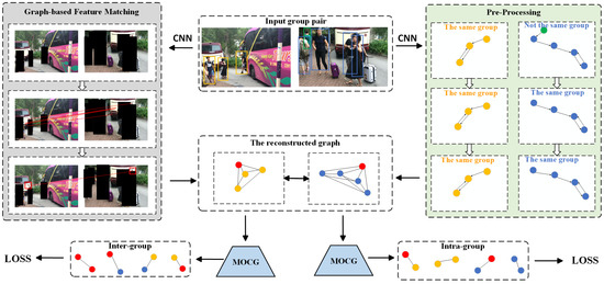 Illustration of our proposed framework. First, group pairs are used as input and the model extracts features of single persons and areas that do not contain a person (background information) by CNN respectively. Then, a contextual graph with complete connectivity is constructed using person features as nodes by k-nearest algorithm and removes pedestrians (marked by green box and green node) that do not belong to the same group through the Pre-Processing module. Meanwhile, the Graph-based Feature Matching module aims to obtain matched background features (marked with red boxes) that do not contain pedestrians. Subsequently, the background features as nodes are added to the reconstructed graph. Finally, the node features within the contextual graph are transferred while considering both intra- and inter-group information in the MOCG module.