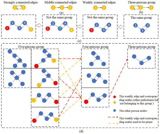 In this module, the edges of the graph are divided into strongly, moderately and weakly connected edges, as shown in Figure 3a. When two nodes choose each other as the nearest node, the edges between them are denoted as strongly connected edges. When a node is selected as the nearest node by some other nodes and also selects other nodes as the nearest node, the edge connecting the node to its nearest neighbor is denoted as a moderately connected edge, such as node 2 → node 3, where → denotes the edges of node 2 choosing node 3 as the nearest node through k-nearest algorithm. When a node selects another node as its nearest node but is not selected by other nodes, the connection between this node and its nearest node is called a weakly connected edge, such as node 1→ node 2 (the rightmost image in Figure 3a). The specific pruning process of the five-persons group is shown in Figure 3c. Specifically, for the five-persons group, which is judged as different group, where = 4 represents the edges of node 1 → node 2, node 2 → node 3, node 3 → node 4, node 4 → node 5 and = 3 represents the node pairs of node 1 and node 2, node 1 and node 3, node 1 and node 4, which are not in the same group. Therefore, the weakly connected edges (node 1 → node 2 or node 4 → node 5) and their nodes need to be pruned to obtain the four-persons group. If the edge of node 4 → node 5 is longer than node 1 → node 2, the longer weakly connected edges and its node (yellow node 5) should be removed. Subsequently, the four-persons group continue to determine whether the group is the same group, which is judged as different group, where = 3 represents the edges of node 1 → node 2, node 2 → node 3, node 3 → node 4 and = 2 represents the node pairs of node 1 and node 2, node 1 and node 3, which are not in the same group. Finally, the weakly connected edges and their node (red node 1) are pruned to obtain the three-persons group. In addition, the pruning process of all five-persons, four-persons, and three-persons groups are simulated respectively, as shown in Figure 3d.