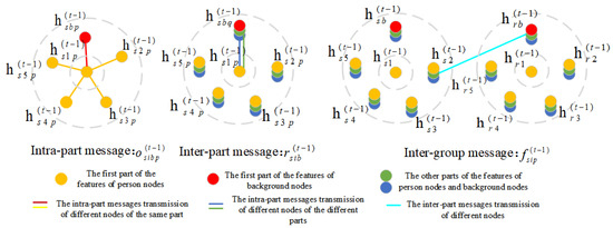The inter-part correlation calculation are defined in a similar manner. The inter-part messages between and can be transferred from person node i and the background node b relating to distinct parts (p, q). The final update attention weights of the inter-part are obtained by merging the background nodes b to the person nodes i: