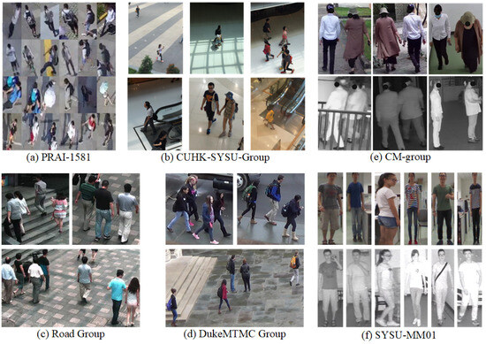 Datasets. (1) the PRAI-1581 dataset [51] contains 39,461 person images from two UAVs flying at heights between 20 and 60 m above ground level and the resolution of person images is 30–50 pixels; (2) the Road Group dataset (RG) [10] contains 162 pairs of group images taken by two cameras and the resolution of group images is 89–302 pixels; (3) the DukeMTMC Group dataset (DG) [11] based on DukeMTMC dataset contains 177 pairs of group images captured by eight cameras and the resolution of group images is about 180–1034 pixels; (4) the CUHK-SYSU-Group dataset (CSG) [14] based on CUHK-SYSU dataset contains 3839 pairs of group images and the resolution of group images is 600 × 800 pixels; (5) CM-group dataset [52] contains visible and infrared 30,946 images of 427 groups and the resolution of group images is 2560 × 1440 pixels; (6) the SYSU-MM01 dataset [53] contains 45,863 visible and infrared person images and the resolution of person images is about 83–548 pixels; (7) the Aerial Image dataset (AID) [54] contains 10,000 aerial scene images, featuring 30 distinct classes with each class containing between 220 to 420 images at an altitude from about half a meter to about 8 m and the resolution of aerial images is 600 × 600 pixels; and (8) RGB-NIR Scene dataset [55] contains 477 images in nine classes in RBG and Near-infrarted(NIR) and the resolution of images is 1024 × 768 pixels. The PRAI-1581, CSG, RG, DG, AID datasets are visible images with a spectral resolution of 390 nm–780 nm, the CM-group, SYSU-MM01 datasets are visible-infrared images with a spectral resolution of 1 mm–750 nm, and RGB-NIR Scene dataset are RGB-NIR images with a spectral resolution of 1000 nm–1700 nm. In addition, the PRAI-1581 and AID datasets contain the messages of geometric and spatial resolution, while the other datasets only contain geometric resolution messages. Figure 5 and Figure 6 show the examples of images.