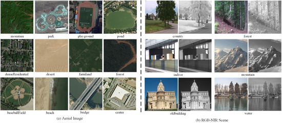 Examples of images in the (a) Aerial Image and (b) RGB-IR Scene datasets.