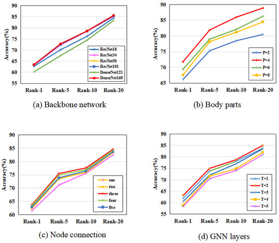 Backbone network. The impact of different backbone networks are analyzed on model performance. In this study, the ResNet50 backbone is replaced by ResNet18, ResNet34, ResNet101, DenseNet121 and DenseNet169. Figure 7a shows the experiment results. Significant performance decline is observed when utilizing shallow networks, especially in Rank-1. Furthermore, the utilization of ResNet101 only resulted in minor improvements when compared to ResNet50. These results highlight the substantial influence of distinct backbone networks on the performance with our model. Ultimately, it is clearly easy to observe ResNet50 strikes an optimal balance between model complexity and performance, making it a suitable choice for the backbone in our setup.