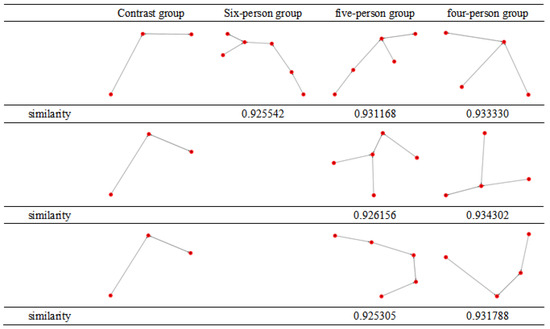 Pre-Processing Module. As the group moves, the members of the group will change. To solve the above issue, the PREP module presented aims to remove additional pedestrians. The experimental results of the pruning process in six-persons groups are shown in Figure 11. The algorithm is utilized to determine the structural similarity between the pruned group and contrast group. It can be observed that the group similarity is higher after each pruning operation. In addition, the different structures are designed with five-persons groups and four-persons groups and the situations in which they are judged as the same group and different groups, as shown in Figure 12a,b. The experimental results indicate that compared with the contrast groups, groups judged as different groups exhibit lower similarity than groups judged as the same.