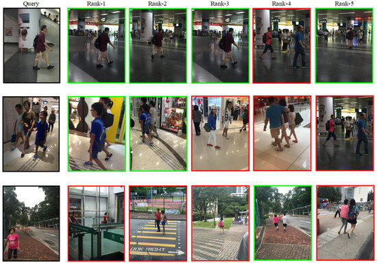 The retrieved visualization of UAV person re-ID results. The black bounding boxes images are the query, the red and green bounding boxes denote wrong and right retrieval results, respectively.