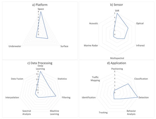 Table 1 outlines the contents of the published papers. Among the variety of topics we suggested when launching this Special Issue, we received a good response from our colleagues dealing with visible-infrared and radar sensors, used alone or in combination. The most considered sensing platforms are located in space, thus confirming the advantages derived from the wide swaths obtainable over the more limited views offered by airborne and terrestrial sensors. Among the spaceborne sensors, SAR seems to be preferred by virtue of its all-weather, all-lighting properties, despite its limited spatial resolution and attitude/incidence-dependent distortions. Figure 1 shows the number of papers included in this Special Issue, organized by platform (a), sensor (b), data processing (c), and application (d). Detection and classification dominate. Deep learning approaches play a major role in data processing. As anticipated, the data processing strategies are the characterizing features of all the papers, allowing a maximum of interpretable information from heterogeneous sensor and auxiliary data. Besides the already cited review by Zalewski et al. on the evolution of maritime GNSS and RNSS standards, this Special Issue features ten papers, summarized here by application.