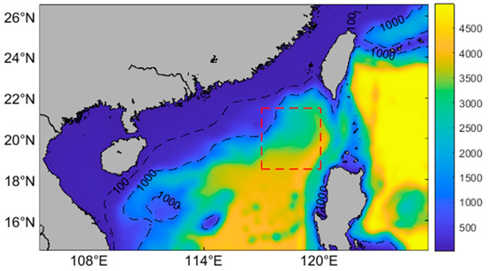 The Regional Ocean Modeling System (ROMS) was employed to generate three-dimensional oceanic fields and quantify the assimilation of SWOT observations within the OSSE system. The primitive equations governing ROMS were formulated under the hydrostatic and Boussinesq assumptions. This study is centered on the Northern South China Sea (NSCS) domain, spanning from 105.5°E to 125.7°E and from 14.5°N to 26.5°N. Within the OSSE framework, a twin experiment featuring two cases was conducted, with horizontal resolution and vertical S-coordinate configuration set at 1/36° × 1/36° (1/10° × 1/10°) and 50 (30), respectively. The topography fields for the two cases were derived from the General Bathymetric Chart of the Oceans (GEBCO) data and the ETOPO1 global relief model integrated topography. The modeling minimum and maximum depths across the entire domain were set at 10 and 5000 m, respectively. Figure 1 illustrates the smoothed bathymetry used in the nature run. Model inputs, encompassing the initial state, surface air–sea forcing fields, and boundary conditions for both the nature run and free run, are detailed in Table 1.