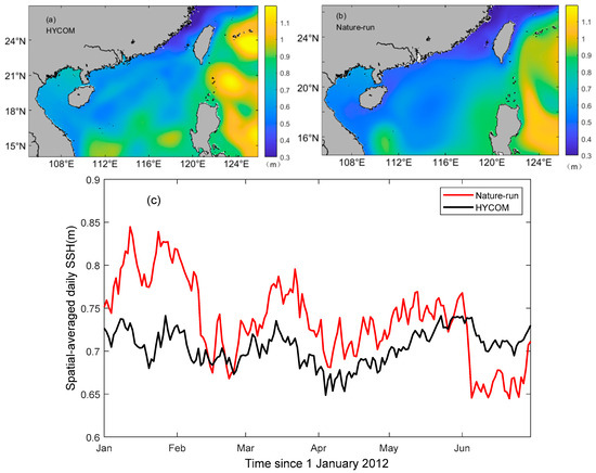 Qualitatively, the monthly mean nature SSH filed for June 2012 exhibits favorable comparability with assimilative HYCOM reanalysis data. As depicted in Figure 2a,b, the spatial patterns, including height magnitude and location, demonstrate noteworthy similarity, particularly along the Kuroshio western boundary current. The assimilation of multi-platform data such as satellite altimeter observations, in-situ temperature and salinity profiles from XBTs, Argo floats, and moored buoys by HYCOM contributes to a more realistic reconstruction of mesoscale characteristics. Additionally, we also explored the daily variation in sea surface elevation from 1 January to 31 June 2012. The spatial averaged value of the daily SSH derived by HYCOM and nature run is presented in Figure 2c. The consistent tendency in the seasonal cycle captured by the two SSH data series is observed, and the difference with the HYCOM reanalysis product had been effectively controlled since the middle of February.