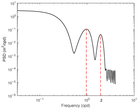 Furthermore, the internal tidal energy contained in the surface elevation field was examined. For simplicity, a subdomain proximal to the Luzon Strait, demarcated by the red box in Figure 1, was selected for analysis. The two-dimensional power spectral density (PSD) was computed for each grid spanning the period from 1 January to 31 August 2012. The spatially averaged energy spectrum is depicted in Figure 3. The observed spectrum reveals prominent peaks near semidiurnal and diurnal frequencies. The power spectral densities adjacent to these frequencies reach values as high as 10−1 m2/cpd, underscoring the substantial reproduction of primary internal tidal energy within the nature run. Consequently, the demonstrated feasibility of utilizing the SSH fields from the nature run for simulating SWOT measurements is established.