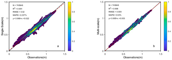 As illustrated in Figure 5, the model analysis states derived from both the single-scale and multi-scale assimilation approaches are consistent with the observations. However, the statistical error comparison between the two assimilation approaches indicates that the multi-scale strategy acquires better gap reduction towards the SSH observations. The coefficient of determination between the multi-scale corrected model fields and the observations has a certain improvement, from 0.991 to 0.998, the RMSE is significantly reduced by half, and the MAPE decreases from 2.237% down to 0.93%. Moreover, the points in the multi-scale panel are more concentrated near the diagonal line, and after fitting the two scattered “model-observation” data using the polynomial basis, the approximation function of the multi-scale case moves closer to the line . Therefore, the enhancement optimized by the proposed multi-4DVAR scheme is validated by analyzing the residual difference between the model state and the assimilated observations.