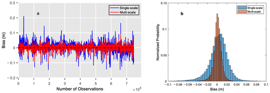 The bias comparison between single-scale and multi-scale components. The left panel (a) shows the residual difference of the posterior surface elevation analysis at the observation position while the right panel (b) compares the bias distribution of the two assimilation schemes wherein the error has been normalized.