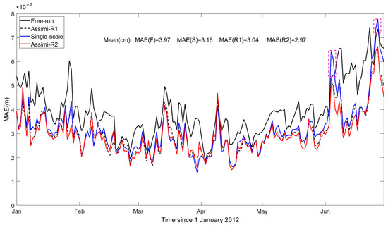 The regional averaged mean absolute error (MAE) with respect to the nature run case and the time series covering the period from January to June. The SSH accuracy values of the free run and the single-scale and multi-scale assimilation were evaluated.