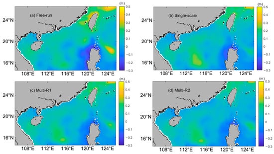 Moreover, to delineate the distinctive performances of the single- and multi-scale assimilation schemes, a spatial analysis of errors was undertaken. Initially, a representative scenario depicting horizontal SSH updates is presented in Figure 9, with a comparison between the free run and nature run serving as a reference for comprehensive evaluation. In summary, the findings align with the earlier regional averaged mean absolute error (MAE) analysis in the time series, indicating overall improvements in SSH analysis fields across the entire region for all assimilation cases.