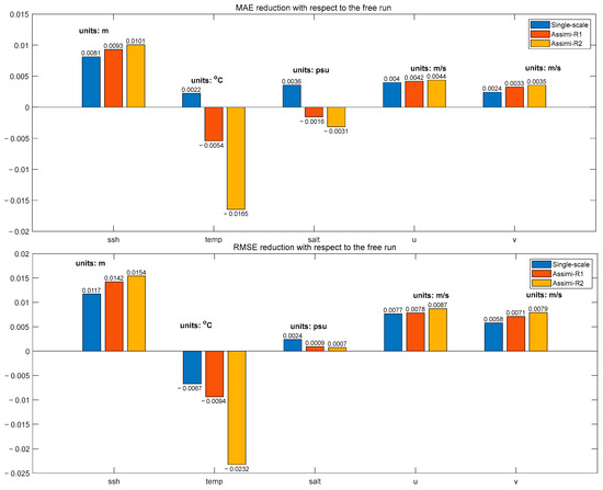 The averaged error reduction (MAE: top, RMSE: bottom) in the ocean state (SSH, temperature, salinity, eastern and northern velocity components), wherein the error decreases are analyzed with respect to the accuracy of the free run case.