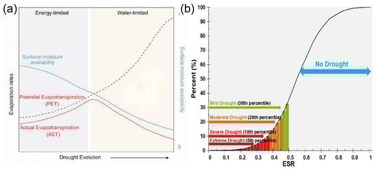 (a) Illustration of the PET and AET evolution from an energy-limited state to a water-limited state (reproduced from Pendergrass et al. [30]). (b) Illustration of the ESP values corresponding to drought severity.