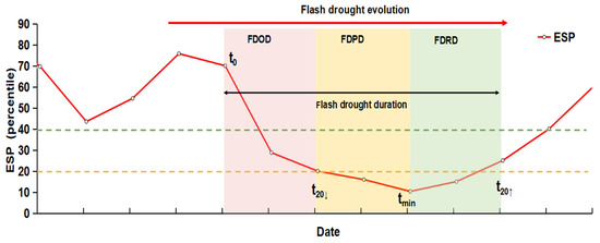 A schematic illustration of a flash drought development based on the ESP (FDOD: flash drought onset development duration; FDPD: flash drought persistence duration; FDRD: flash drought recovering duration).