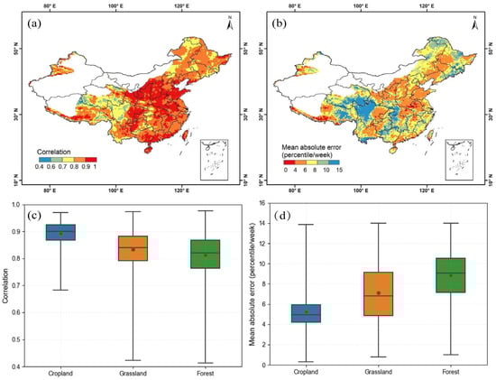 Spatial patterns of (a) correlation coefficients and (b) mean absolute errors between the weekly ESP and the weekly SMP derived from the GLDAS-Noah dataset for China in the growing season (March–September) during the period 1979–2018 (areas with an annual mean aridity index smaller than 0.2 are masked). The boxplots are (c) correlation coefficients and (d) mean absolute errors between the weekly ESP and SMP for land cover types (cropland, grassland, and forest) in China in the same period (the red dot is the mean value).