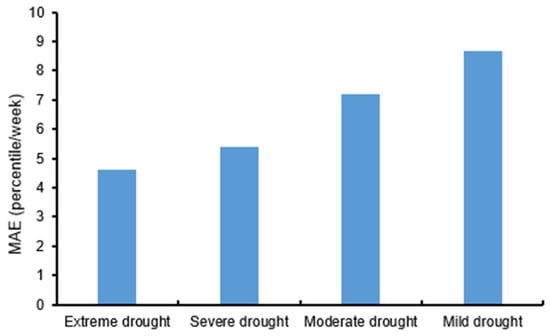 Figure 5 shows the mean absolute error (MAE) between the weekly ESP and weekly SMP at different drought severities (as defined in Table 1) during the growing season (March–September) for the period 1979–2018. The MAE between the SMP and ESP decreased with the increase in drought severity. Under extreme and severe drought conditions, the ESP value was close to the SMP value.