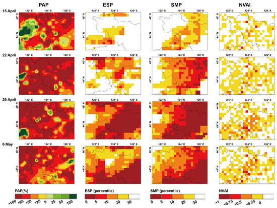 Spatial distribution of the PAP, ESP, SMP, and NVAI in Jilin province from 15 April to 6 May 2015.