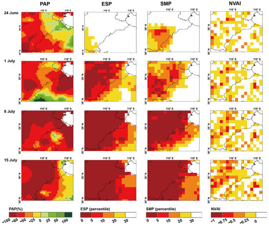 Spatial patterns of the PAP, ESP, SMP, and NVAI in Hebei province from 24 June to 15 July 2010.