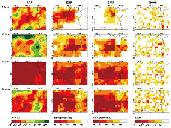Spatial patterns of the PAP, ESP, SMP, and NVAI in Hunan province from 3 June to 24 June 2013.
