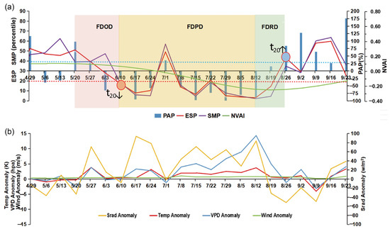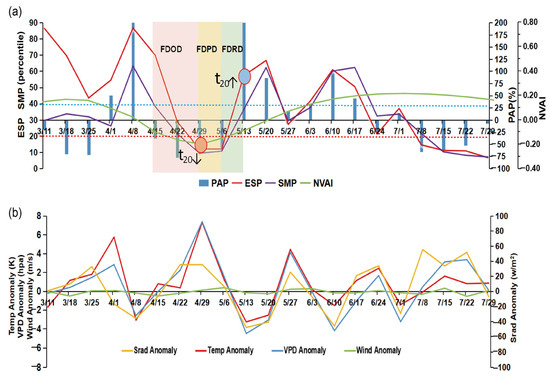 Drought in western Jilin province in 2015: (a) temporal evolution of the PAP, ESP, SMP, and NVAI; (b) time series of 7-day air temperature, wind speed, VPD, and downward shortwave radiation anomalies.