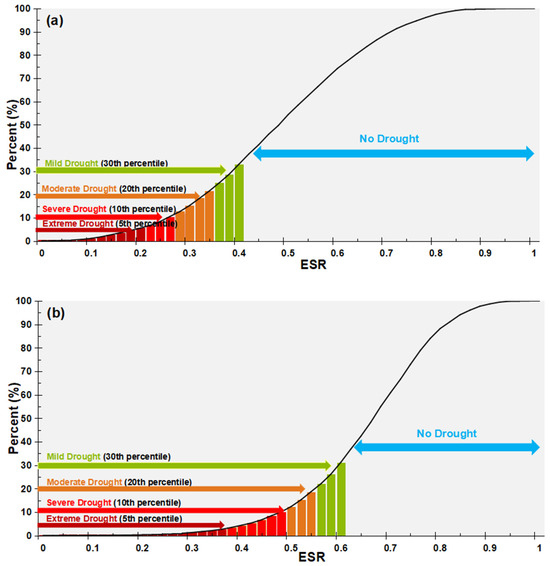The cumulative distribution function of ESR on the DOY 197 based on the GLDAS-Noah dataset for the period from 1978 to 2018 in (a) Region B in the semi-arid zone and (b) Region C in the humid zone. The exact locations of Region B and Region C are outlined in Figure 3b.