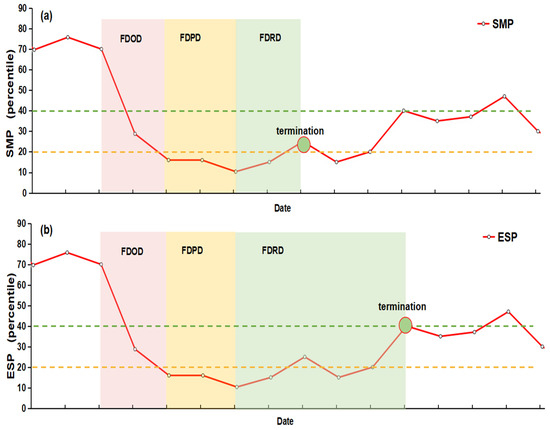 Secondly, this study clearly defines the onset, duration, and recovery phases of flash droughts based on the ESP criteria (see Figure 2). Previous ET-based indices (such as SESR and EDDI) only emphasized the rapid development phase of flash droughts but ignored the persistence and recovery phases of flash droughts [24,28,65,66]. The persistence and recovery phases of flash droughts should be considered because they have a significant impact on ecosystems [41,67]. In addition, the SMP-based method considers the flash drought to end when the SMP value rises above the 20th percentile (see Figure 14a). In this study, we defined the flash drought as ending when two criteria are met: (i) the ESP value rises above the 20th percentile; (ii) the condition above the 20th percentile persists for at least two weeks (see Figure 14b). These new criteria and definitions are more reasonable, as they ensure that the flash drought is fully mitigated, and, therefore, more conducive to quantitatively assessing the duration and intensity of flash droughts.