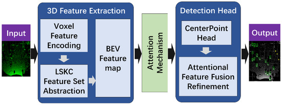 AFRNet performs 3D feature extraction on the point cloud acquired via roadside LiDAR, then uses the CBAM attention module for feature optimization, and finally uses the CenterPoint detection head for target detection and feature fusion refinement. The block diagram of AFRNet is shown in Figure 2.