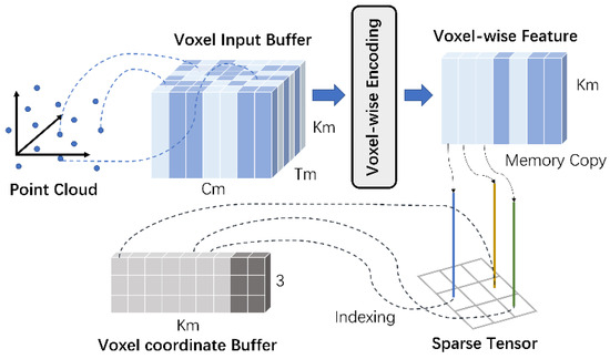 We established a LiDAR-based spatial coordinate system for the input 3D point cloud data, and set the forward direction as the positive direction of the X-axis, the left as the positive direction of the Y-axis, and the upward as the positive direction of the Z-axis. Then the entire 3D space was divided into voxels, the length, width, and height of each voxel was set to , and the size of the entire 3D space was set to . We adopted the efficient voxel feature encoding module in VoxelNet to assign all point clouds in the space to their corresponding voxels [40], and completed the encoding of each voxel. We created a voxel input feature buffer to store each voxel feature data, where is the maximum number of non-empty voxels, is the maximum number of points in each voxel, and is the encoding feature of each point, as shown in Figure 3. All points of data will be traversed. If the number of voxels corresponding to a point in the voxel coordinate buffer and the number of points in the corresponding voxel input feature buffer is less than Tm, the point will be inserted into the voxel input feature buffer. Otherwise, this point will be discarded.
