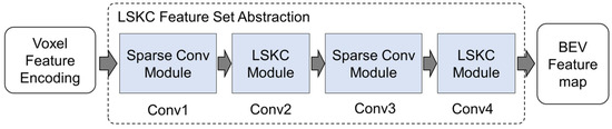 We used the LSKC feature set abstraction module to calculate the voxel features of input data at different scales under different convolution groups, as shown in Figure 5. We combined the advantages of 3D sparse convolution and large kernel sparse convolution to propose a LSKC 3D feature extraction backbone. The 3D convolutional layer was denoted as . The 3D sparse CNN in our method was composed of four convolution groups: Conv1, Conv2, Conv3, and Conv4. Each group except the first group was down-sampled, and the sampling ratios were 1, 2, 4, and 8, respectively. Conv2 and Conv4 are LSKC modules.