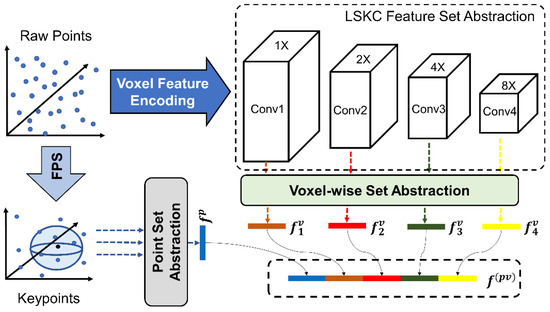The feature extraction part is shown in Figure 6. First, this part uses farthest point sampling (FPS) to uniformly collect keypoints from the original point cloud data [39]; the sampled keypoints are recorded as , where . Then the set abstraction (SA) module proposed in PointNet++ network will extract the point-by-point feature of these keypoints [43], and the obtained point feature is denoted as . Referring to the PV-RCNN network [23], the voxel-wise set abstraction module is used here to extract voxel features of different convolution groups in 3D CNN. Four convolution groups correspond to four voxel-wise features volume. The voxel feature set in each voxel-wise feature volume is expressed as follows: