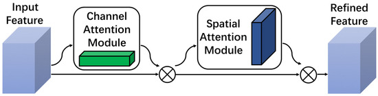 Suppose the input feature is , using CBAM to derive the one-dimensional channel attention map and the two-dimensional spatial attention map , the overall attention process can be summarized as follows: