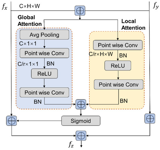 We incorporated an attentional feature fusion module [49] into the refinement module to fuse the BEV features and point-voxel (PV) features. The attentional feature fusion module combines local features and global features on CNN, and spatially fuses different features with a self-attention mechanism. The attentional feature fusion module structure is shown in Figure 9.