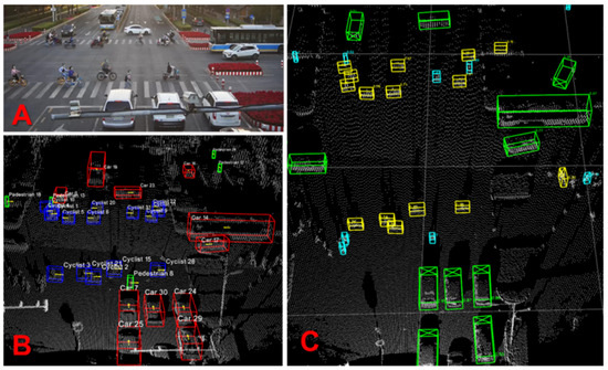 Visualization of experimental results of the AFRNet algorithm. (A) Image captured by the camera. (B) Visualization of object ground truth in dataset. (C) Visualization of detection result. The green, yellow, and blue 3D boxes represent vehicles, cyclists, and pedestrians, respectively.