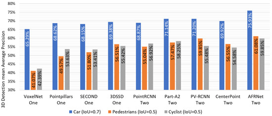 Figure 12 shows the 3D detection results of different algorithms for car, pedestrian, and cyclist in the test set under the DAIR V2X benchmark, where the mAP is used as the evaluation metric. From the data in Figure 12, it can be found that AFRNet achieves the highest detection accuracy for cars, pedestrians, and cyclists. Compared to the benchmark method CenterPoint, the mAP of AFRNet is 6.01%, 4.53%, and 5.27% higher in car, pedestrian, and cyclist detection, respectively. Compared to the PV-RCNN, the mAP of AFRNet is 4.73%, 1.23%, and 4.37% higher in car, pedestrian, and cyclist detection, respectively. The two-stage AFRNet exhibits significantly higher detection accuracy compared to all one-stage methods.