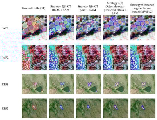 There are several interesting observations from Figure 3. First, when SAM is fed with ground truth points (Strategy 3b), the resulting masks tend to be smaller than when SAM is fed a ground truth BBOX (Strategy 2b). This is likely because when the input prompt is smaller, SAM’s predictions tend to favor labeling smaller masks with higher confidence. Second, some of SAM’s segmentation results exhibit holes (IWP1, Strategy 2b, and Strategy 4b), whereas the MViTv2 results (Strategy 0) do not display any holes. This is likely because SAM is trained on datasets containing holes, whereas MViTv2 is trained exclusively on domain datasets that do not include holes. Third, the results of Strategy 4b (feeding SAM with MViTv2-predicted BBOX) and Strategy 0 (MViTv2) are similar since they both segment masks based on the same BBOX information. Consequently, when MViTv2 fails to make certain predictions (e.g., RTS1), SAM (Strategy 4b) will also be unable to produce the corresponding prediction at the respective location.
