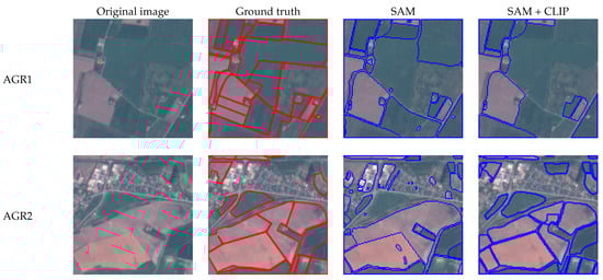 The same set of experiments was conducted on SAM using this dataset. Table 5 illustrates the zero-shot performance by SAM and the combined SAM+CLIP model. It is evident that using SAM alone results in a relatively low model performance. As depicted in Figure 4, SAM may mistakenly segment two crop fields as one large field or fail to identify certain crop fields. Upon incorporating CLIP with SAM and utilizing different prompts for semantic filtering, increased prediction accuracy is observed, especially when “Crop land” is used as a prompt. The last column in Figure 4 showcases results using this approach. Notably, CLIP helps to remove some irrelevant urban regions (as seen in image AGR2), contributing to the enhancement of the final results. In contrast, when the prompt “Agricultural field” is utilized, the model yields slightly lower accuracy than when using SAM alone (Table 5). This suggests that the choice of prompt text is a factor influencing the CLIP model’s results.