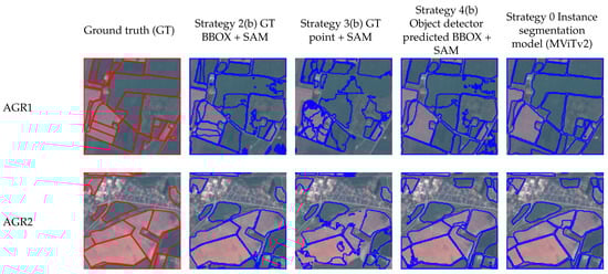 The second approach is to provide SAM with prior geospatial knowledge; for example, the location (a point or a bounding box) of objects of interest as a prompt, and then ask SAM to generate the segmented masks of objects of that class. This is a surrogate of instance segmentation; Strategies 2 to 4 in Table 2 are such examples. Strategy 2 is to feed the ground truth BBOX to SAM and ask SAM to segment the object within the given region. This strategy provides the strongest geospatial knowledge among all strategies. Strategy 3 involves feeding SAM with the ground truth point locations for the objects of interest and asking the model to segment the object near the point. Strategy 4 involves training an object detector through supervised learning on the training datasets and using its predicted BBOX to feed the SAM model for instance segmentation. As Strategies 2–4 all require the use of training data in the segmentation pipeline, they are not considered zero-shot learning. Since SAM provides code for the model, the pipelines implementing Strategies 2–4 can be fine-tuned using domain-specific datasets.