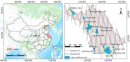 Geographical location of Jiangsu Province and the distribution of lakes and reservoirs.