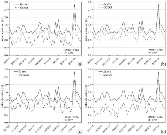 The different retrackers can be more suited to a specific surface. The Ocean, OCOG (Offset Center Of Gravity) [42,43], Ice sheet, and Sea ice retracking algorithms of Sentinel-3 SAR mode are designed, respectively, for open ocean and coastal zones, sea-ice margins, ice-sheet margins, and sea ice. Figure 5 shows the comparison between the water level time series obtained by the four retrackers of Tai Lake (track A052) and the in situ measurements. It was found that from January 2017 to December 2020, the RMSE of the OCOG algorithm can reach 0.31 m with the R of 0.963, which is better than the other three trackers.