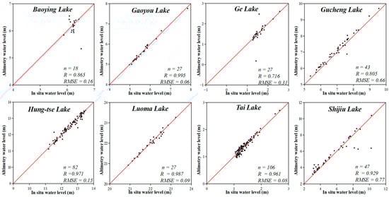 When two or more tracks passed through a lake on the same day, we selected the continuous group of high-quality points with the highest quantity and the least RMSE and calculated its average to represent the water level of the day. The correction of height level deviations can only be performed on the premise of the existence of field data. Table 3 shows the values of R and RMSE before and after deviation correction. The RMSE values of eight lakes were improved to some extent, especially Baoying Lake. Figure 6 displays the correlation coefficient between altimetry water level and in situ water level after deviation correction. With R exceeding 0.5 and RMSE under 1 m, the Sentinel-3 satellite achieved effective capabilities for monitoring lake water levels across a range of study sites. For example, demonstrating superior performance, accuracy metrics in Tai Lake, Gaoyou Lake, and Luoma Lake surpassed 0.9 for R and fell below 0.1 m in RMSE terms. It is important to note that the scatter plot contains a few apparent, significant inaccuracies. Correlation analysis may, therefore, understate their consistency.
